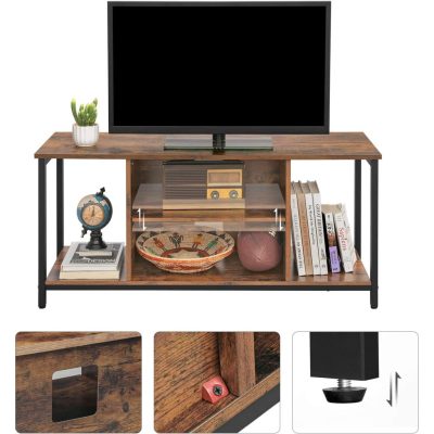 TV-állvány 50 hüvelykes TV-hez, TV-szekrény nyitott polcokkal, TV-konzol nappaliba, szórakoztató szoba, rusztikus barna és fekete