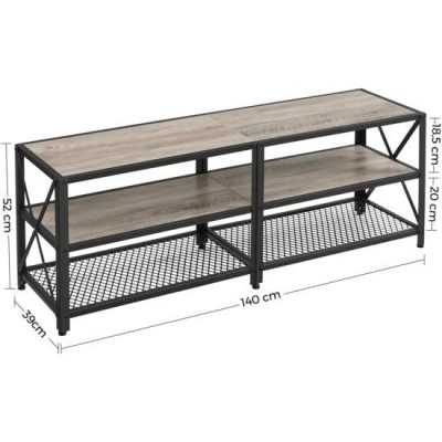 • Tv szekreny, tv-asztal polcokkal, acélkerettel, 140 x 52 x 39 cm, greige és fekete