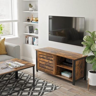 Ipari TV-állvány 48 hüvelykes TV-hez, TV-szekrény tolóajtóval és 2 polccal, mélydeszka a nappaliban, hálószoba folyosóján, acél, 110 x 40 x 45 cm, rusztikus barna