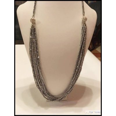 Üveg kristály gyöngyökből álló nyaklánc, ami több féle képpen is viselhető. A felső rész lecsatolható, a mágneses shamballa kapcsolónál, így akár rövid nyakékként ( 46 cm ) , akár hosszú láncként ( 80 cm ) is viselhető. A rövid nyakék csavart, vagy lógós kivitelben is hordható. Ezüst színben is kapható!