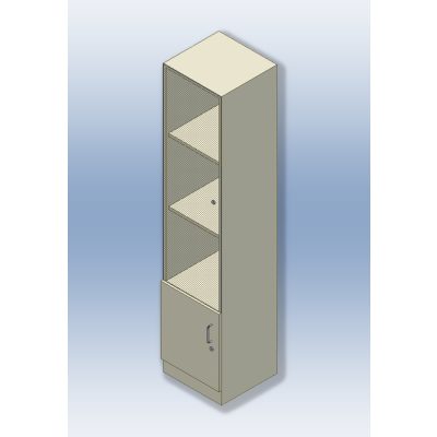 Laminált bútorlapból készült szekrénytest, felül üvegajtóval. Alsó és felső ajtók biztonsági zárral vannak ellátva. Alapszín: fehér.