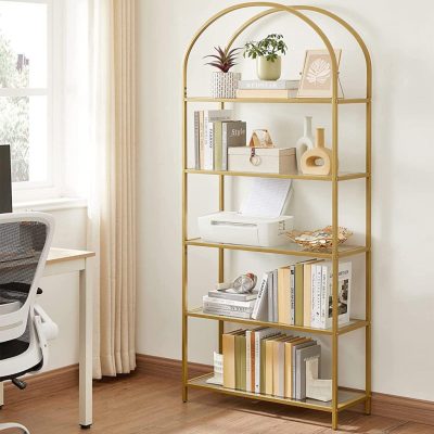 5 szintes polcok, edzett üveg, íves kivitelű könyvespolc, erős acélszerkezet, nappaliba és hálószobába, arany színű