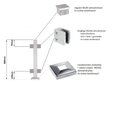 Rozsdamentes üvegkorlát 1 db oszlop.