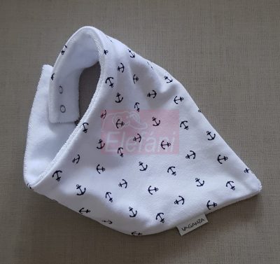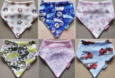 Háromszög alakú nyálkendő, mintás Az egyik oldala frottír, a másik pamut Anyagában mintás Több minta