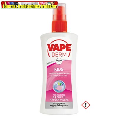 VAPE DERM KIDS szúnyog- és kullancsriasztó permet Figyelmeztető mondatok: Súlyos szemirritációt okoz. Linalyl acetate-; Linalool-; Imidazolidinyl Urea-; Hexyl salicylate-t tartalmaz. Allergiás reakciót válthat ki. Óvintézkedésre vonatkozó mondatok: Orvosi tanácsadás esetén tartsa kéznél a termék edényét vagy címkéjét. Gyermekektől elzárva tartandó. A termék használata közben tilos enni inni vagy dohányozni. Kerülni kell az anyagnak a környezetbe való kijutását. LENYELÉS ESETÉN: azonnal forduljon TOXIKOLÓGIAI KÖZPONTHOZ vagy orvoshoz. SZEMBE KERÜLÉS ESETÉN: Több percig tartó óvatos öblítés vízzel. Adott esetben a kontaktlencsék eltávolítása, ha könnyen megoldható. Az öblítés folytatása. Ha a szemirritáció nem múlik el: orvosi ellátást kell kérni. A tartalom/edény elhelyezése hulladékként: az országos előírásoknak megfelelően. Hatóanyaga: 8,93% Cymbopogon winteranius olaj (hidratált, ciklizált). Biztonságos felhasználást szolgáló intézkedések: Ügyeljünk arra, hogy a folyadék nyálkahártyára (szem, száj), nyílt sebbe, irritált bőrre ne kerüljön. Allergiára hajlamos egyének használat előtt kis bőrfelületen győződjenek meg a készítmény ártalmatlanságáról. Akinek a bőre a készítmény hatására allergiás elváltozást mutat, annak, azt bő, szappanos vízzel azonnal le kell mosni! Újszülötteknél és 3 évesnél fiatalabb gyermekeken nem alkalmazható.