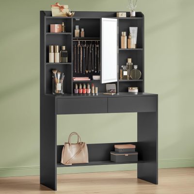 • VASAGLE LED-es fésülködőasztal, 3 fényerőmód, tükörrel és 2 fiókkal, éjfekete