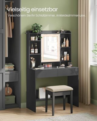 VASAGLE fésülködőasztal LED világítással, 3 szín állítható fényerővel, sminkasztal tükörrel, kozmetikai asztal állítható polcokkal, 2 fiókkal, modern, éjfekete