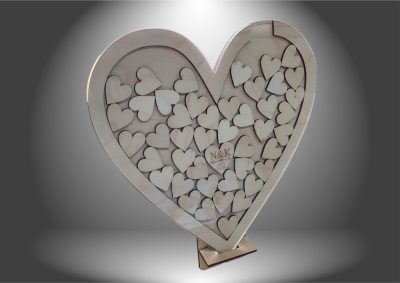 Az egyedi gravírozott szív alakú vendégkönyv tökéletes választás, ha maradandó emléket szeretnél az esküvődről. A vendégek a kis fa szívekre írhatják a nevüket vagy jókívánságaikat, majd bedobhatják őket a gyönyörű szív alakú keretbe. A vendégkönyv gravírozott felirattal még személyesebbé teszi az élményt. Esküvői dekorációnak is kiváló, később pedig otthonod dísze lehet. Egy gravírozott szív alakú vendégkönyv nem csupán praktikus, hanem örök emlék a számotokra, ami mindig eszetekbe juttatja a Nagy Nap különleges pillanatait. Egyedi és kreatív megoldás esküvőre, eljegyzésre vagy akár évfordulóra.