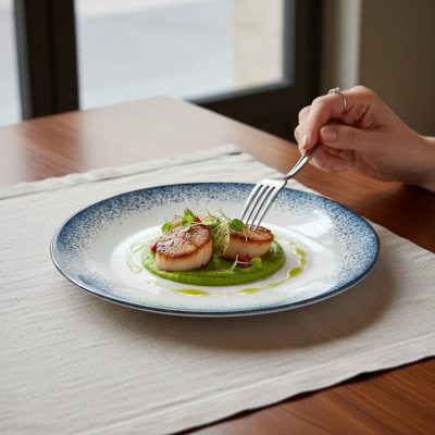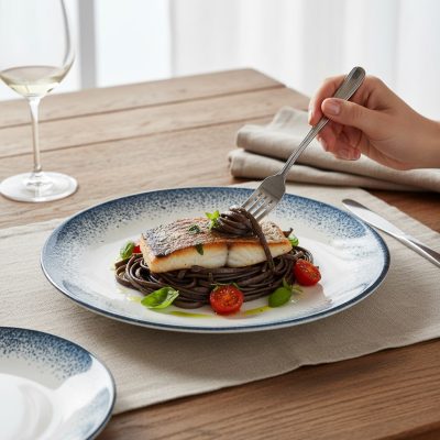 A világos belső felület kiváló kontrasztot ad a fogásoknak, míg a tengert idéző perem elegánsan keretezi az ételt. Nem túl sok, nem túl kevés – pont annyi karakter, amennyi emeli a tálalást, de nem viszi el a fókuszt.
