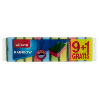 Vileda Rainbow szintetikus szivacs nagy nedvszívó képességgel és csiszoló zöld réteggel a makacs szennyeződések tisztítására. Hosszú élettartam.