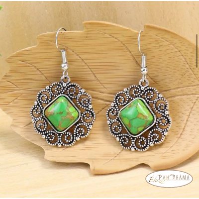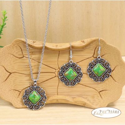 Fashion vintege szett, lógós fülbevaló medálos nyaklánccal, természetes zöld kő díszítéssel.