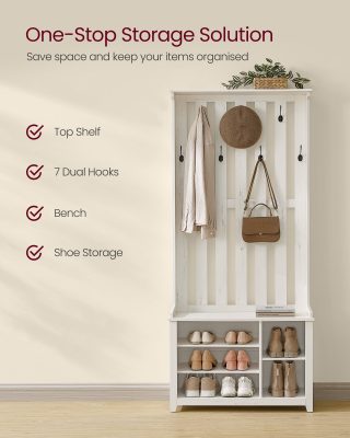 Kabátállvány, cipőpad, polcos kabátállvány, 7 dupla horog kabátokhoz és kalapokhoz, előszobába, hálószobába, nappaliba, 35 x 81 x 180 cm, vintage fehér