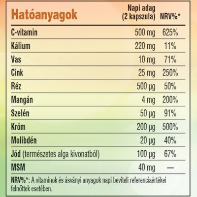 C-vitamin: Hozzájárul a sejtek oxidatív stresszel szembeni védelméhez és a normál energiatermelő anyagcsere-folyamatokhoz.