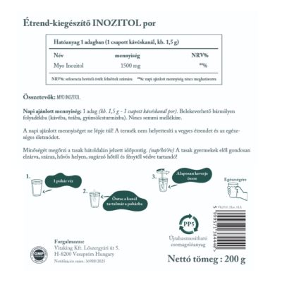 Termékünk por 100% myo inositolt tartlamaz. 200g-os kiszerelésben kapható. Napi adagja 1 csapott kávéskanálnyi ami körülbelül 1.5 gramm. A 200 grammos kiszerelés így 133 adagnak felel meg.