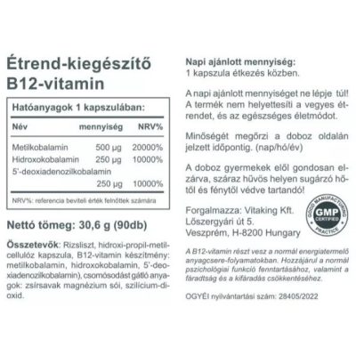 B-12 vitamin természetben előforduló összetevőkkel. Termékünk 500µg metilkobalamint 250mg hidroxokobalamint és 250mg 5’-deoxiadenozilkobalamint tartalmaz kapszulánként. (a B12 természetben előforduló formái) A B12 vitamin részt vesz a normál energiatermelő anyagcsere-folyamatokban, hozzájárul az idegrendszer normál működéséhez, a normál vörösvérsejt-képző?déshez és az immunrendszer normál működéséhez.