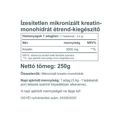 Ez a kedvező hatás 3 g kreatin napi bevitelével érhető el. Por formában igen gazdaságos választás, ugyanis 1 teáskanálnyi adag 3,4 g-ot tartalmaz.