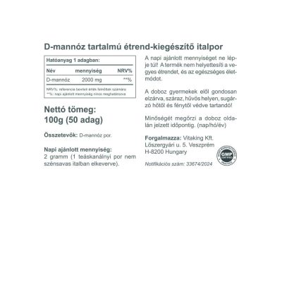100% D-mannóz, semmilyen egyéb hozzáadott adalékanyagot nem tartalmaz.