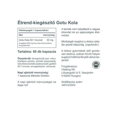 Összetevők: Tömegnövelő szer: mikrokristályos cellulóz, pullalán kapszulahéj, Gotu Kola (Centella asiatica) (gyökér) 50:1 kivonat, emulgeálószer: zsírsavak