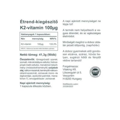 A Vitaking K2 vitamin 100µg MK7 vitamint tartalmaz.