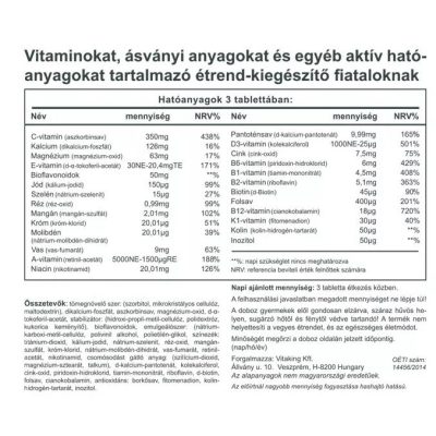 A Vitaking Mega Vitamin Tiniknek készítménye kifejezetten a tini korosztály szervezetének igényei alapján lett összeállítva. Minden fontos vitamint és ásványi anyagot tartalmaz, amivel célszerű kiegészíteni a fejlődésben lévő korosztály mindennapi étrendjét. Az összes szükséges vitamint és ásványi anyagot tartalmazza a tinik számára szükséges mennyiségben.