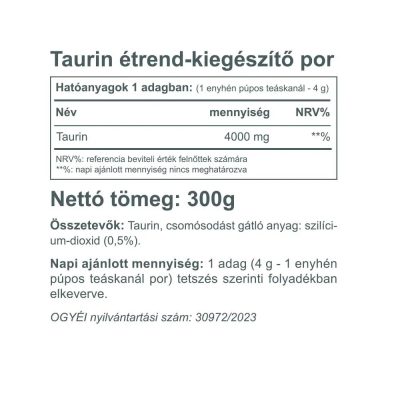 Összetevők: Taurin (99,5%), csomósodást gátló anyag: szilicium-dioxid (0,5%).