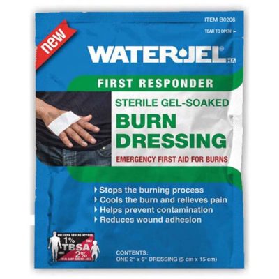 A Water-Jel égési kötszer egy égési zselével átitatott steril kötszer. Kiválóan alkalmas akár a legkomolyabb égési sérülések kezelésére is. Azonnal hűsíti és fertőtleníti az égési sérülést. Megakadályozza a fertőzések bejutását a sebbe és csillapítja a fájdalmat. Az égési zselét a helyén tartja, a sebet sterilen lefedi. A Water-Jel égési kötszert a seben hagyva kell a hagyományos kötszerekkel a sérülést ellátni A hidegvizes hűtésnél sokkal gyorsabb és könnyebben alkalmazható megoldás. A Water-Jel égési kötszer használata egyszerű, nem igényel speciális képzettséget. Ennek köszönhetően nem rabol el felesleges időt az elsősegélynyújtástól és a balesetet szenvedettnek azonnal csökkenti a fájdalmát. Sűrűségénél fogva az égési zselé nem folyik le a sebről.