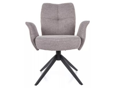 A szürke Brego szövet kárpitozás elegáns megjelenést kölcsönöz, míg a matt fekete fém váz modern kontrasztot teremt. A karfák és a háttámla ergonomikus kialakítása hosszan tartó kényelmet garantál az étkezések vagy munkavégzés közben.