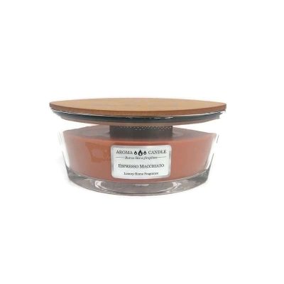 Kávé illatú gyertya, csónak alakú üvegben, fa tetővel.