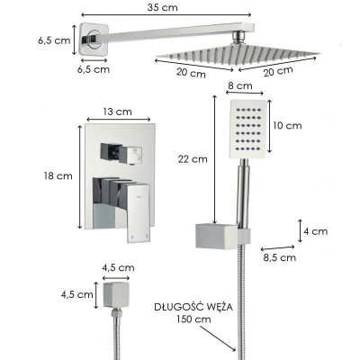 Falsík alatti rejtett zuhanyrendszer esőztető fejzuhannyal és kézizuhannyal, minőségi krómozott felülettel. Tartalmaz egy mechanikus süllyesztett keverőt és egy mechanikus váltókapcsolót kapcsolót, amivel a víz folyása változtatható a felső esőztető és kézizuhany között. A készlet egy süllyesztett vízcsatlakozó konzolt tartalmaz, amely lehetővé teszi a külső panel pontos felszerelését kerámia csempékre. A szett kialakítása követi a jelenlegi trendeket - rendkívül elegáns, tökéletesen illeszkedik egy modern fürdőszobába.