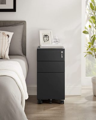 asztal alatti gördülő szekrény 3 fiókkal, előre összeszerelt zárható irodai szekrény akasztós reszelővel iratokhoz, dokumentumokhoz, levélpapírokhoz, 45 x 30 x 60 cm, fekete: